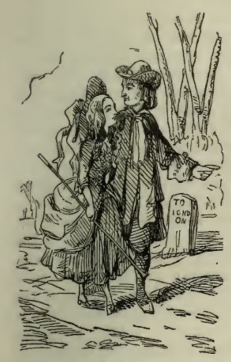 Two figures, a woman holding a stick or thin staff and a man in a curved hat, walk along a path. A sign by the side of the road reads To London. Two sets of forked branches in the background form the letter W from We.