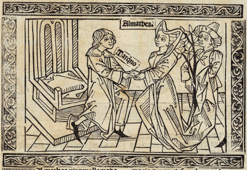 This engraving depicts the sibyl Amalthea handing over books to Tarquinius Priscus. We know that these figures are indeed Amalthea and Tarquinius Priscus as their names are engraved beside and above their bodies to identify them. Amalthea, as explained by Boccaccio, brought 9 books for Tarquinius Priscus, and when he failed to pay her the full price, she burned 3 books at a time until he paid her what she was owed. There is a man standing behind Amalthea depicted holding a tree of some sort.