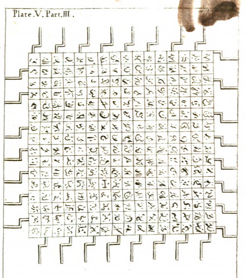 This image depicts an invention created by Laputan Projectors. The invention is to rework the Laputan language. On each of the squares is a symbol representing a phrase in the Laputan language. There are handles which would be turned to create different phrases which would then be analyzed. The same image appears in other editions of Gulliver’s Travels, including those in other languages.