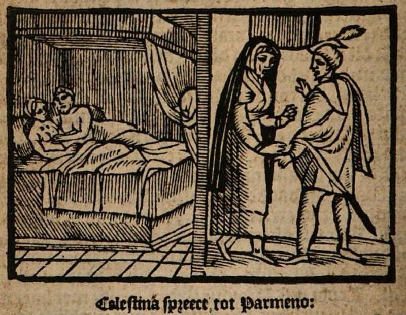 As Celestina leaves Calisto’s house, Calisto tells Pármeno to accompany her to ensure she arrives home safely. Celestina persuades Pármeno to join her and Sempronio in their plot to scam Calisto, and she promises him a share of the profit, as well as her prostitute Areusa, in exchange for his new loyalty. He relents to her bribery, and they both go to Areusa’s house, where Pármeno remains for the night while Celestina returns home. To the right of the illustration, we see Pármeno and Celestina in conversation. She is wearing a robe and a veil, while he is depicted with a hat and a sword mounted on his belt. To the left, both Pármeno and Areusa can be seen unclothed in bed together. Oddly enough, Areusa appears to be wearing a veil despite her nudity.
