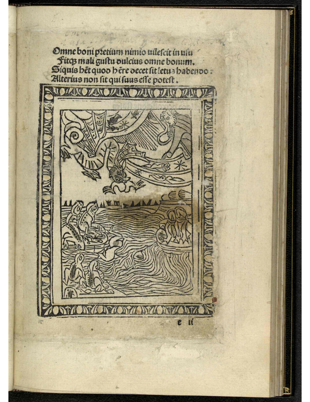 The lower half of the image is a vast sea, with frogs dispersed around everywhere. Most are looking up, while a few are jumping into the water. Above them, in the upper half of the image, is a large dragon that is swooping down on them. The large wings of the dragon are ornated with strange patterns, some look like snowflakes while others resemble fish. To the right of that dragon is a man with a long beard and long hair. He is pointing down at the water with two fingers.