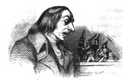 In this image we see Gulliver speaking to four Lilliputian pages, who were assigned to Gulliver’s household by the Emperor. The pages stand on a box, looking up to Gulliver. The pages wear conical hats with plumes coming out of the top. The same image appears in the 1843 Krabbe edition.