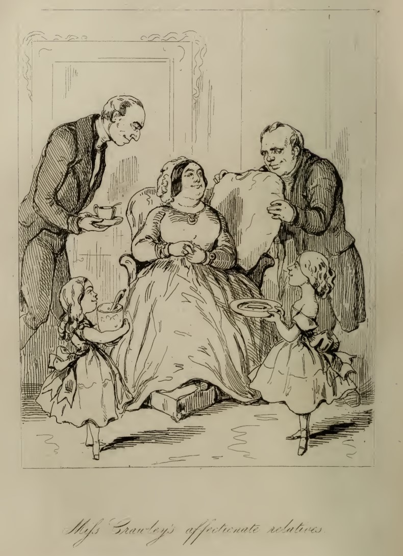 Miss Matilda Crawley is seated in a large, comfortable armchair. She is looking to the right of the image at her brother, Sir Pitt Crawley, who is adjusting one of her cushions. To the left is her other brother, Reverend Bute Crawley, who is bringing her a cup and saucer with a spoon. At her feet are Violet, holding a vase, and Rose, holding a plate, both attired in fancy dresses. Below the illustration is printed in cursive its title, Miss Crawley’s affectionate relatives.