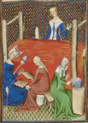 This illumination depicts Gaia Cyrilla, the wife of King Tarquinius Priscus, standing in the background of the image spinning wool. She is illustrated wearing a blue dress and a crown to signify her royal status. She is depicted spinning as she was renowned for being skilled in the art of weaving during her time. There are other women in the image who are also working with wool. Boccaccio believes Gaia Cyrilla to be praiseworthy as wool working was an admirable craft.