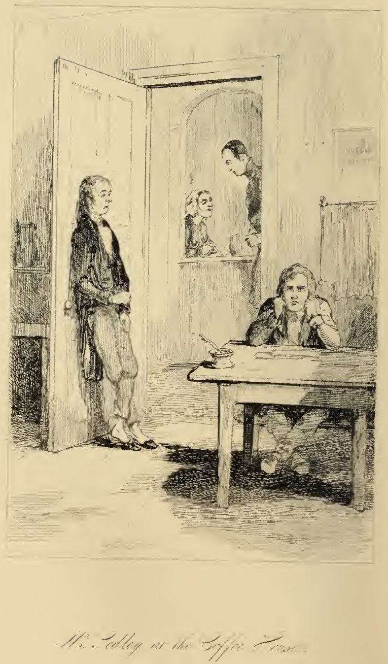 John Sedley is seated at a table at the Tapioca Coffee-house, slouching over with his elbows resting on the table and his scowling face between his fists. On the table in front of him are several pieces of paper and an inkwell with a quill. The door to the room is held open by a bored-looking man who leans against it. Through the doorway, William Dobbin can be seen talking to the woman at the desk. Below the illustration is printed in cursive its title, Mr. Sedley at the Coffee-House.