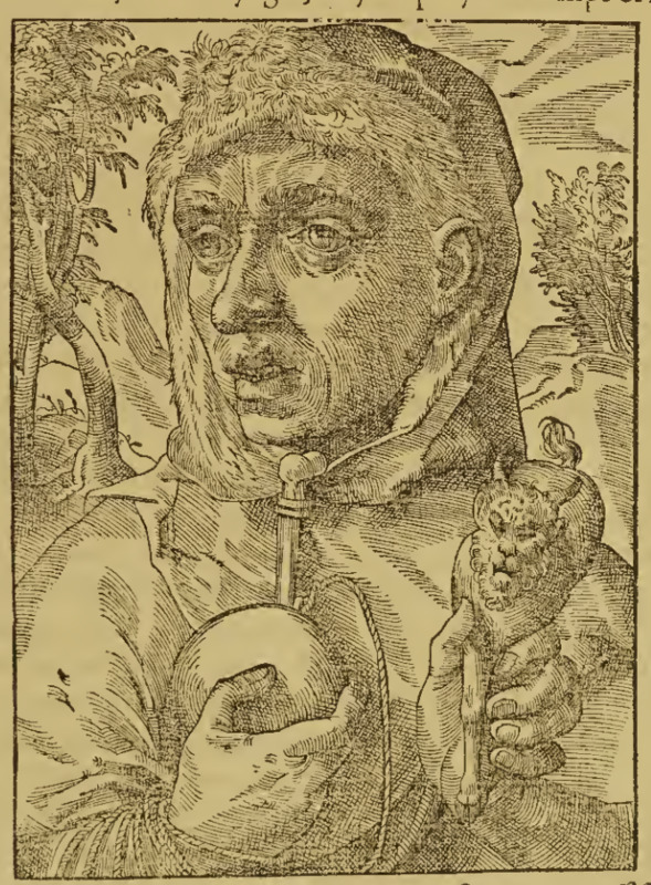 An Indigenous South American man of large stature holds an animal in one hand and an object in the other. He wears a long-sleeved garment with a hood. This image comes from a chapter entitled ‘D’une Isle, où les hommes sont grands de dix à douze pieds', (Of an island, where the men are tall at 10 to 12 feet), referring to an island in the region of Patagonia, South America. A Spanish expedition in 1520 led by Ferdinand Magellan explored the South American coast of Patagonia (today Argentina and Chile) and encountered a group of Indigenous people, likely the Teheulche. The Spaniards described the Teheulche as giants, but later travelers disputed this description, saying the Teheulche were of average build. This image is identical to one found on page 905 of Paris 1575 (Chaudière).