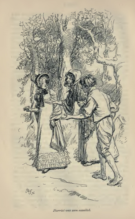 In this image we see Harriet being accosted by gypsies on her way home from the ball. The gypsies asked for money and Harriet was distressed. Frank Churchill was walking along the same road and chased them away, bringing the distressed Harriet to Hartfield. This scene occurs in chapter 39. The characters are shown in the traditional regency style. Harriet wears a dress with an empire waistline and a bonnet, and a shawl wrapped around her shoulders. The gypsies wear loose fitting clothes and are barefoot. The regency period dated to the early nineteenth century (1811-1820) when George, Prince of Wales, later George IV (r. 1820-1830), reigned as regent for his mentally ill father, King George III (r. 1760-1820). The regency period is associated with the rise of neoclassicism in art and fashion.