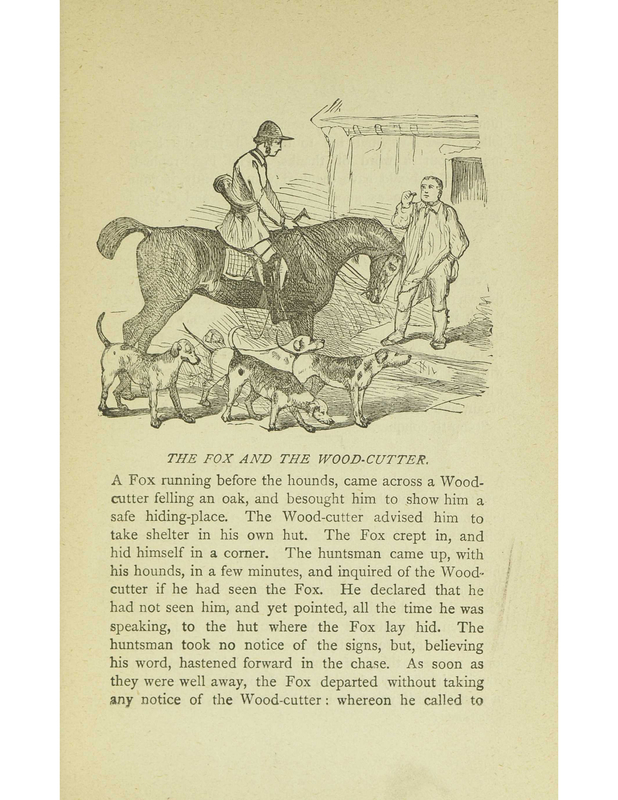 A man wearing a horse-ridding uniform is upon his horse. He wears a calling horn on his back and holds what seems to be an axe in his left hand, meaning he is the woodcutter. They have come to a stop in front of a man. The man looks up at the woodcutter with a curious look. Five hounds sniff at the feet of the horse.