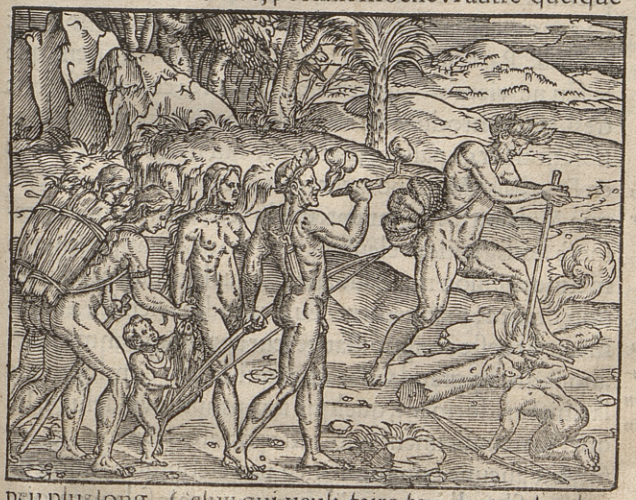 An Indigenous man wearing a feathered headdress and ornament at his back starts a fire by twirling a long stick against a log on the ground. Another man, also wearing a feathered headdress and carrying a bow, watches and smokes a cigar (or similar item). Several women and children are also amongst the group, including a small child carried in a basket on a woman’s back and another child who carries a miniature bow and kneels on the ground to watch the fire starting. This image is identical to one found in Frankfurt, 1557.