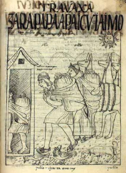 This image is reflected in the final chapter of Ayala’s chronicle where he provides a description of labours and festivals that occur in the rural areas of the Spanish colonial Andes during each month of the Inca calendar year. This image depicts the month of July, which was a month of distributing the harvest from the corn and potato fields. The sun is shining in the top right corner of the image. There are three indigenous men illustrated carrying large sacks of their harvest on their backs as they walk into a small hut, presumably to store the harvest until they distribute it. One man is standing in the doorway of the hut as he looks back to the other two men. They have three llamas accompanying them. By their feet are two chickens and a dog eating feed off the ground. The mountainous Andean landscape is illustrated in the background of the image with birds flying over top. The caption written beside the hut reads collca camayoc, despensero [manager of the barns]. The caption at the bottom of the image reads julio, chacra conacuy [july, eighth month].