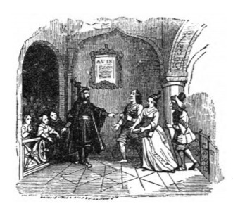 Here we see a depiction of the schools in Lilliput. The school system is a form of boarding school paid for by the Emperor, and as such interactions between children and parents is limited. The central figure is the headmaster, identified by his dark robes. Three children stand behind a gate on the left side of the image, while a man and a woman – the parents of the children – are ushered in. The headmaster holds out his arm to stop the parents from coming too close to the children, as the school limited physical contact with the children. According to Gulliver, parents were only permitted to visit their children twice a year for one hour. These visits were supervised by a teacher. Bringing gifts to the children was permitted and showing affection for them was strictly limited. This image comes when Gulliver describes the education system in Lilliput in the sixth chapter in which Gulliver discusses the values and traditions of the Lilliputians. The same image appears in the 1839 Krabbe edition.