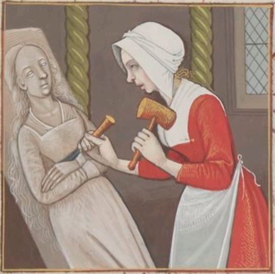 This illumination depicts the young Roman virgin Marcia holding a chisel in her right hand and a hammer in her left as she sculpts out a figure of a woman. Boccaccio explains that Marcia is worthy of renown for her chastity and for her sculpting and artistic abilities. She is known to have mostly painted and sculpted figures of women, which is why she is sculpting a statue of a woman in the image.