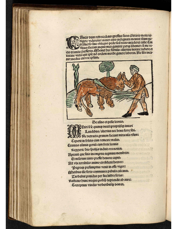 - A man standing on the left side of the image grabs the ear of a donkey wearing a lion’s skin. In the background, there is a tree with leaves in the centre, and a tree without leaves and branches on the left side of the image.