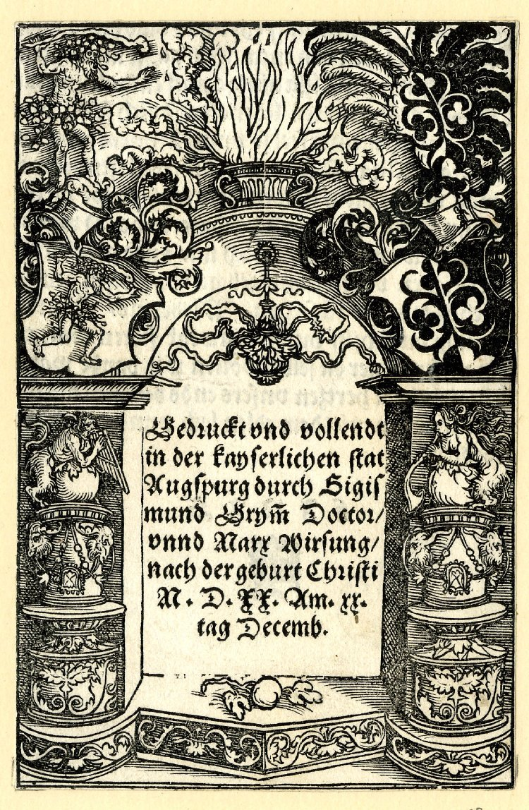 An ornately decorated title page. Two figures playing musical instruments appear atop the pedestals on either side of the illustration. The male figure on the left is playing the panpipes (or syrinx), and his horns and goat’s legs indicate that this is possibly a representation of the Greek deity Pan. The figure on the right is female and also has the legs of a goat, but it is difficult to ascertain her identity from this illustration alone. The entire image is nearly identical to the one found on the title page. The first difference can be seen in the top left corner, where the feathers and coat of arms have been replaced by an aged man with a stick of some sort. The second difference is found in the inscription, which reads: Gedruckt und vollendt in der kayserlichen stat Augspurg durch Sigismund Grymm Doctor/ unnd Marx Wirsung/ nach der geburt Christi M. D. XX. Am. xx. tag Decemb. This can be roughly translated as: [Printed and completed in the Imperial State (City) of Augsburg by Doctor Sigismund Grymm/ and Marx Wirsung/ MDXX after the birth of Christ on the XX day of December (December 20th, 1520).] The prefix ‘Doctor’, attached to the name of Sigismund Grymm, refers to his education and his previous role as a physician and pharmacist (his professions before he became a printer/publisher).