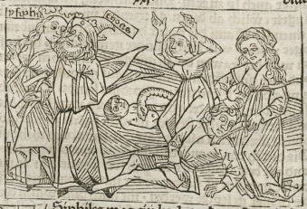 Hypsipyle and her father King Thaos of Lemnos are depicted on the left side of the engraving. We know that the figures are Hypsipyle and Thaos as the creator engraved their names beside their bodies. Hypsipyle appears to be in discussion with her father, as she tells him that the women of Lemnos are planning to turn on all the men of the city and kill them. Boccaccio explains that Hypsipyle warns her father of the crime so that she can help him escape. There is a woman on the right side of the engraving with a sword in her left hand and a man’s head in her right as she carries out the plan to kill the men of the city. Later in life, Hypsipyle has a ward named Archemorus. He is depicted in the background of the engraving, lying on the ground with a snake biting into his chest. This kills the child, and Hypsipyle is illustrated with her hands in the air as she grieves for him.