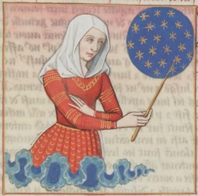 This illumination depicts Proba holding a stick in her hand as she points to the world. This is to represent her teaching history to the world. Proba is renowned for her intellect and intensive knowledge of literature, including works from Virgil. Proba had taken lines from the Aeneid, Bucolics, and the Georgics and transformed them into a cento focusing on the Old and New Testaments. Proba was said to have known the Scriptures by memory, which was something not even many men were able to do.