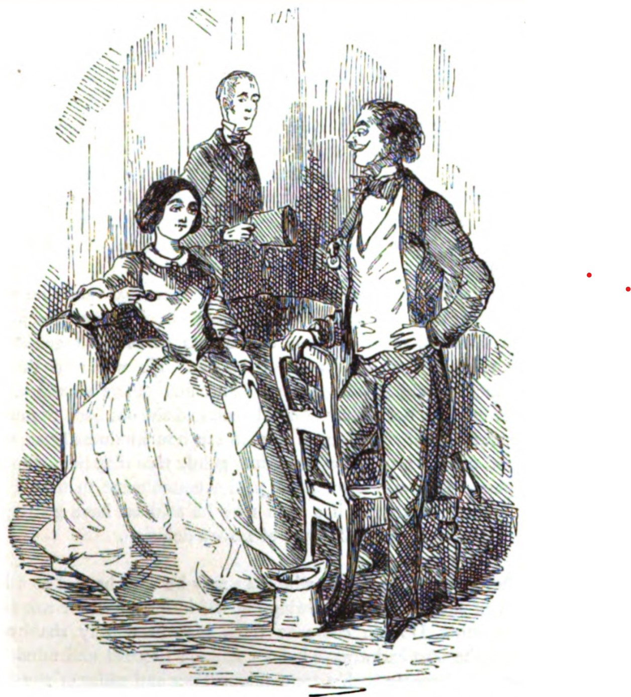 Captain Swankey of the Body Guard stands with one knee on a wooden chair and his hat on the ground, describing pig-sticking to Amelia Osborne, who sits on a sofa with a paper in her hand, looking amused. In the background, Major Dobbin has come upon them while walking past the room.
