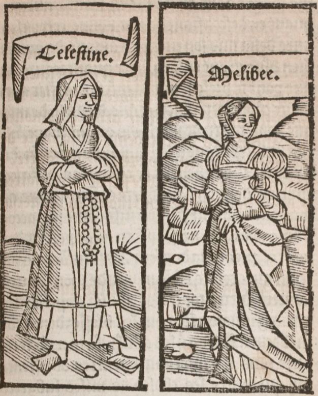 To the left, we see Celestina wearing a robe and a veil, with what appears to be a rosary hanging from her waist. The right panel depicts Melibea, also wearing a robe and a veil. Both figures are placed outside.The left panel is identical to the panel found on the title page, and on pages 70, 114, 146, and 225 of the text. The right panel is identical to those found on pages 12 and 271, and is nearly identical to those found on page 84 (where it is labeled ‘Lucrecia’), pages 173, 287, 306, and 317 (where it is labeled ‘Areusa’), and page 350 (where it is labeled ‘Alisa’).