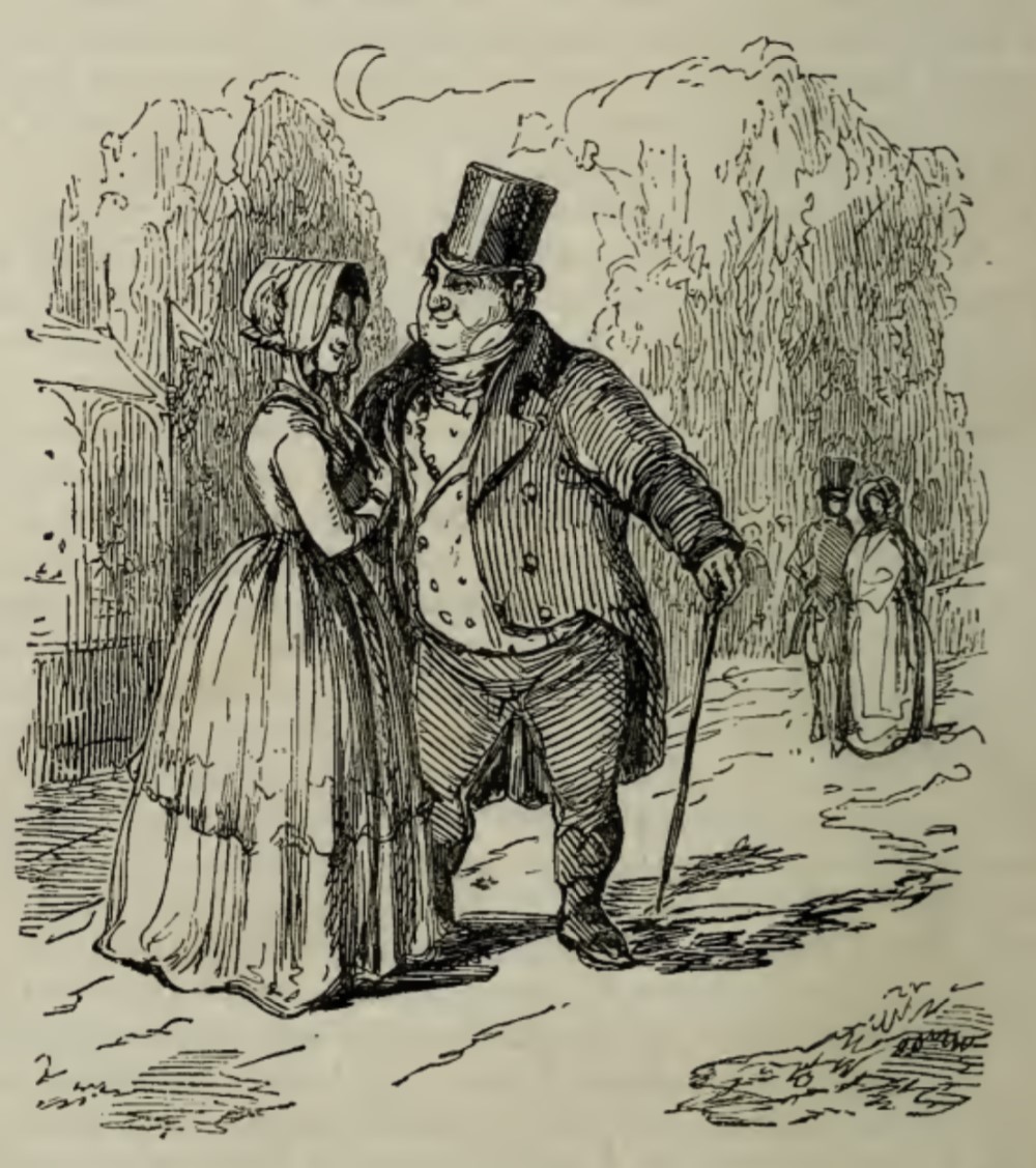 Rebecca Sharp, wearing a bonnet, holds onto the arm of Joseph Sedley, who is wearing a top hat and carrying a cane. The two figures are standing beneath a crescent moon. In the background is another couple, possibly George Osborne and Amelia Sedley, possibly a pair of strangers.