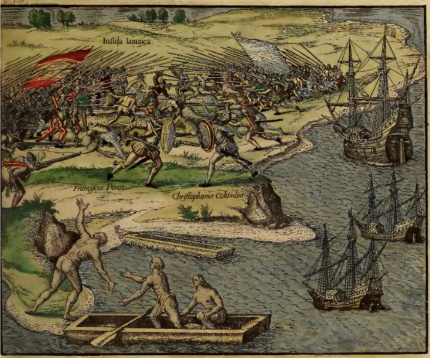 On the island of Jamaica, Christopher Columbus and Francisco de Porras (both labelled in the image) engage in battle. The two men face off against each other, each armed with a sword and shield. To one side of the two men and stretching along the shore, their two armies engage in combat with muskets, swords, and spears. Three European ships are anchored along the shore. In the foreground, three Indigenous people either arrive or depart the area by canoe. One of the men, standing on the shore, gestures widely in the direction of the battle. This image is identical to one found on page 175 of Frankfurt, 1594, but colored.