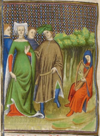 This illumination depicts Antonia, the daughter of the famous Mark Antony and Octavia. She is illustrated on the left side of the image wearing a green dress and a garment on her head. Antonia is famous for having remained a widow for the rest of her life following her husband Drusus’ death. She spent most of her time with her mother-in-law, Livia, who is presumably one of the women depicted on the left side of the image. There is a man attempting to garner Antonia’s attention, however, she has her hand up to reject him as she remains chaste her entire life.