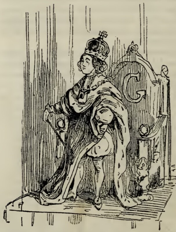 Georgy Osborne, dressed as a king in a crown and robe, stands in front of a throne engraved with the first letter of his name.
