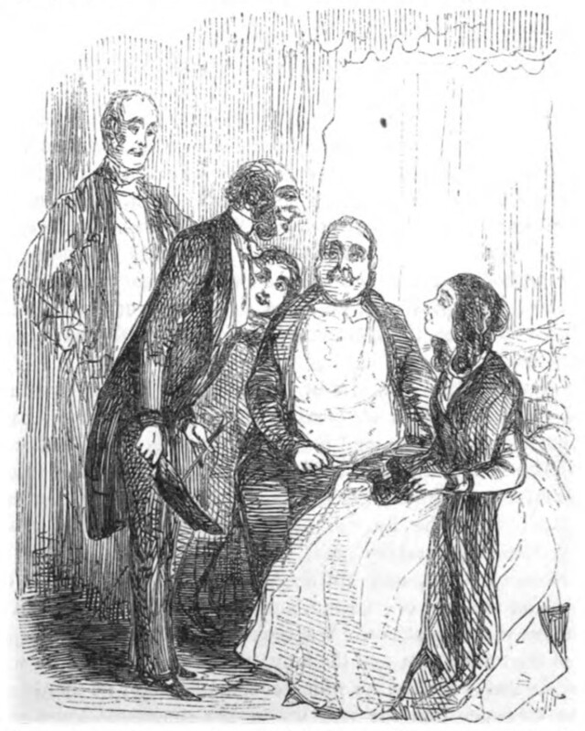 Lord Tapeworm, the Secretary of Legation, bows as he introduces himself to Amelia Osborne with what he believes is a charming smile. Next to Amelia is seated her brother Joseph. Georgy is standing behind his uncle, peering around at the Secretary with curiosity. Next to him, William Dobbin stands with his hands on his hips.
