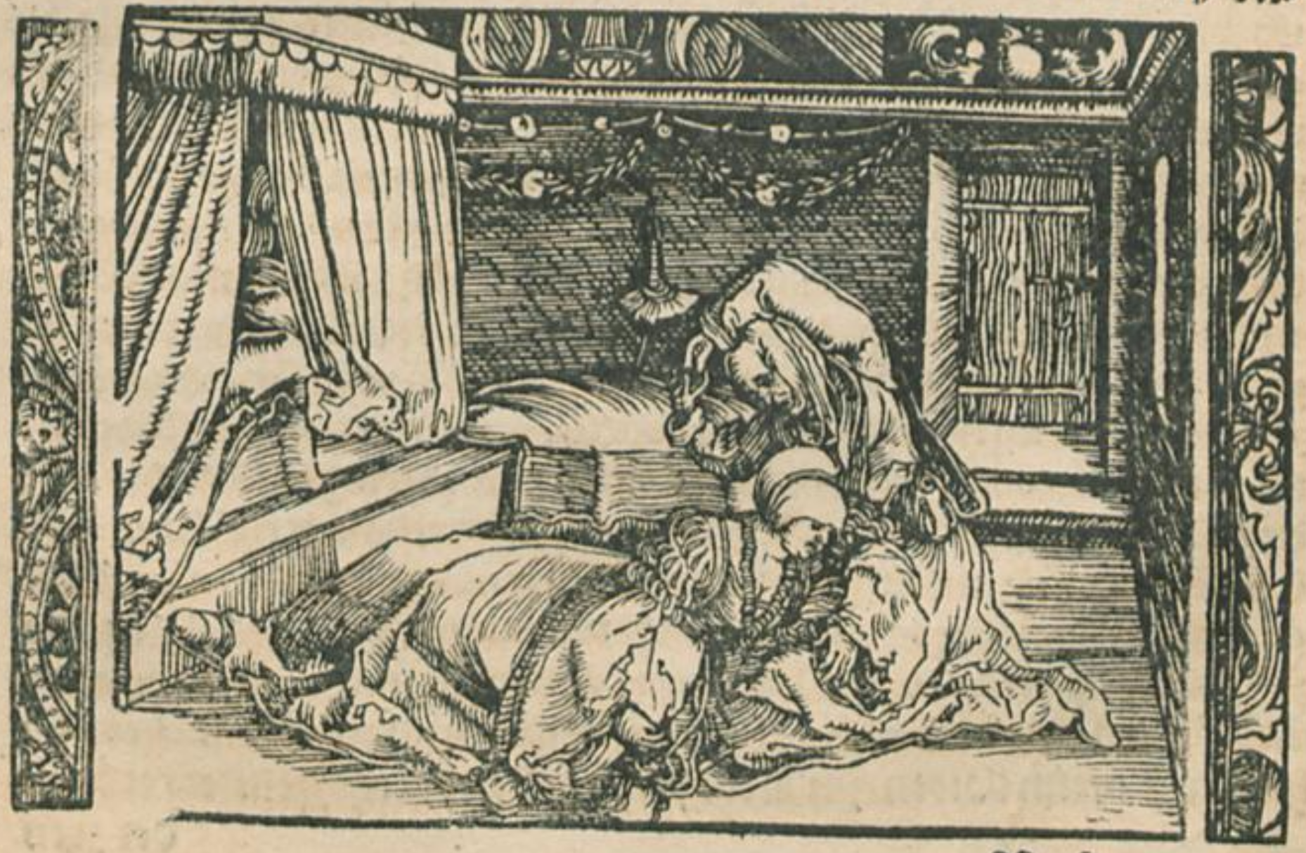 Celestina (upper figure) informs Melibea (lower figure) that she can only be cured if she reveals her love for Calisto, which causes Melibea to experience intense emotions and faint. Upon waking, she finally acknowledges her love for Calisto. Celestina tells her that she will be cured if she meets with Calisto at midnight, and Melibea agrees. As Celestina departs for home, she encounters Melibea’s mother Alisa, who asks her the purpose of her visit. Alisa asks Melibea the same question, and when the two answers differ, she warns Melibea to avoid Celestina.