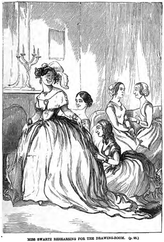 Miss Rhoda Swartz stands in front of Jane and Maria Osborne, dressed in a large gown with many pieces of jewelry and feathers in her hair. In the background, Miss Wirt and Miss Swartz’s chaperone Miss Haggistoun are seated on a sofa, talking to each other. Below the illustration is printed its title and location in the story, MISS SWARTZ REHEARSING FOR THE DRAWING-ROOM. (p. 98.).