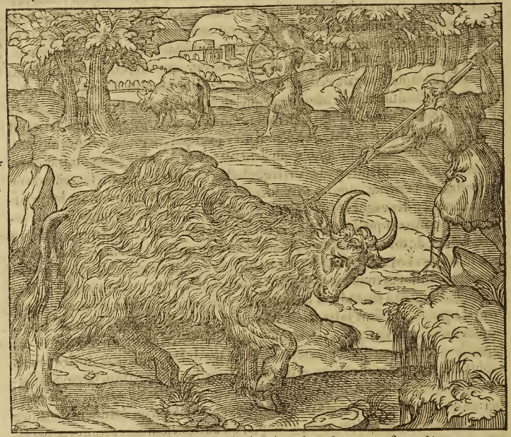 Two Indigenous people hunt large animals in Florida. The animals, which are likely bison, have long shaggy fur and curved horns. The two men wear garments made from the animals’ pelts, which protect them from cold (according to the text), and use a spear and a bow and arrow to hunt the animals. Thevet mentions in the text that ‘Buttol’ is the Indigenous peoples’ name for the animals. This image is identical to one found on page 1007 verso of Paris, 1575 (Chaudière).