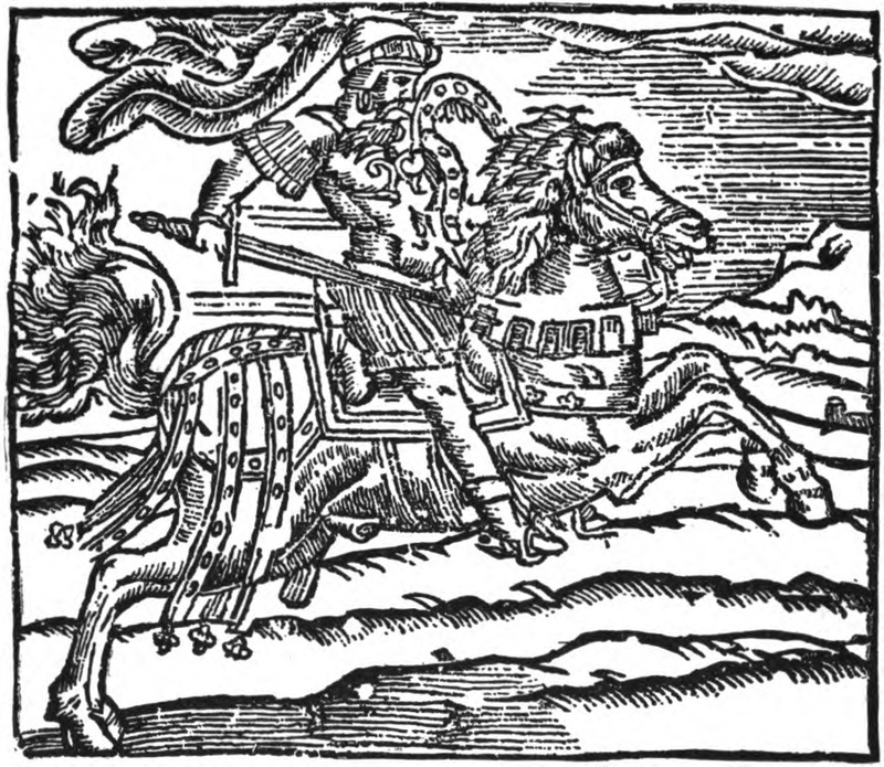 The Cid. Facsimile of cut from reprint in Library of the Hispanic Society of America of old chapbook, Historia del muy esforzado caballero el Cid Ruy Diaz, Campeador. Sevilla: Manuel Nicolàs Vazquez. n. d