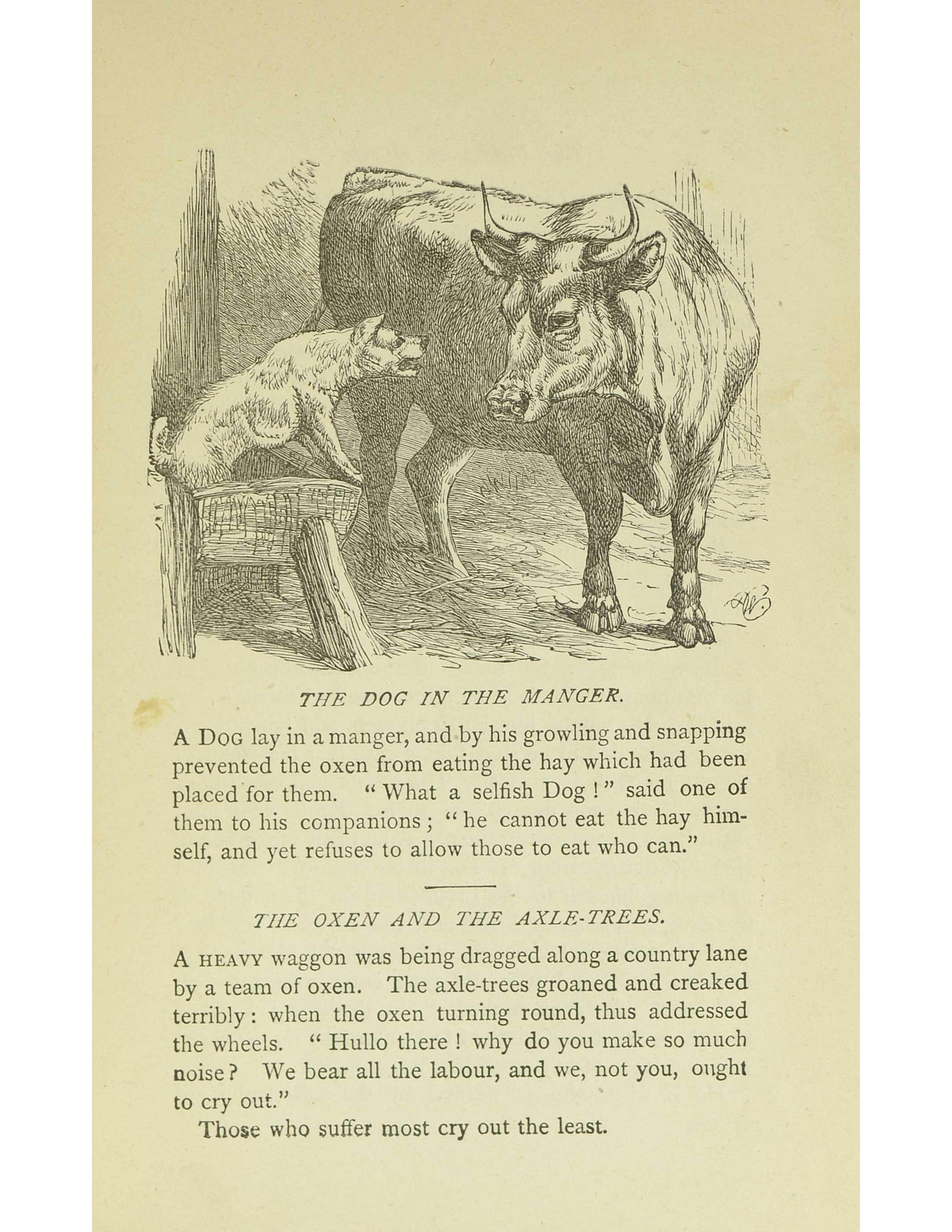A dog is inside of a manger. Its hind legs stay inside the box, while he rests his two front legs on the top of the box. The dog in the manger is on the left-hand side of the image. The dog is looking straight ahead of him, to the right, and is barking. A large ox is in front of the dog, seeming angry that it cannot access its food. Its large head is slightly turned in the direction of the dog, but not completely.