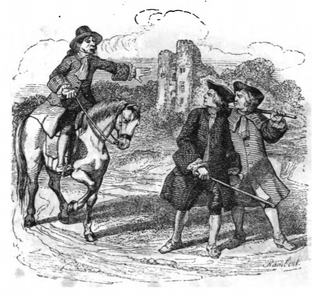 Here we see Gulliver riding on a horse after arriving in England. He waves people out of the way as he rides home. He writes that he felt as though he were on Lilliput because everything felt so small. Thus, he waves people out of the way, fearing he might trample people. Naturally, he received several strange looks from people walking along the road, which can be seen in the image. The same image appears in the 1843 Krabbe edition.