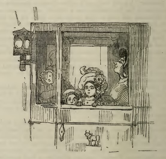 Mrs. Maria Bullock sits in her chariot, looking haughtily away from her nephew Georgy Osborne as he rides by. With her are her husband and their three children, who are looking out the window at their cousin. The carriage has a fancy lantern attached to the window and is decorated on the side with the image of a bull.