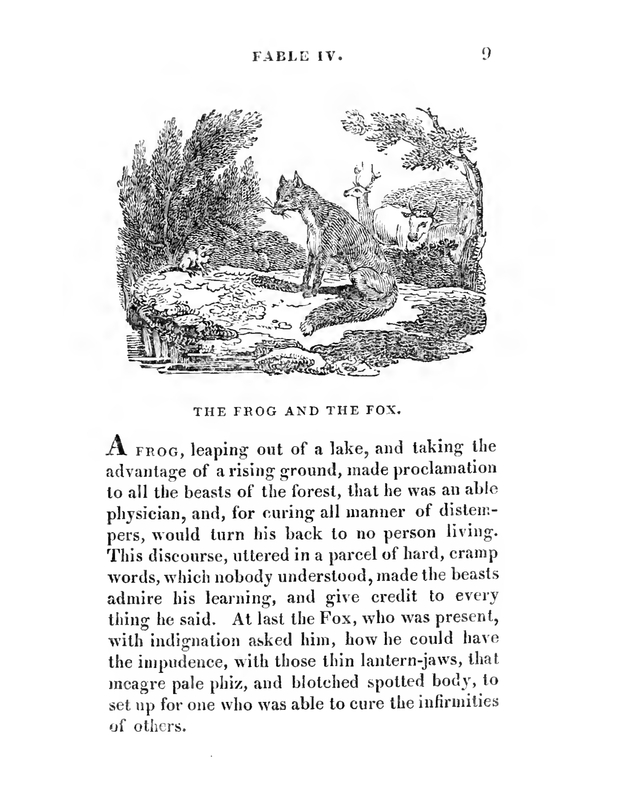 - A Frog sitting on the edge of the lake performing consultation for animals. He was an able physician yet with strong sense of pride. A Fox who was presented with indignation was asking for his diagnose. After him, there were a dear, a bull, and a horse.