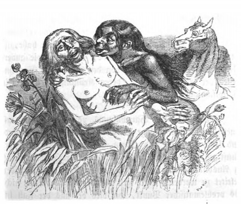 On an especially warm day, Gulliver decided to bathe in the river while on a walk with the Sorrel Nag who was Gulliver’s protector. While Gulliver bathed the nag grazed nearby. A female yahoo watched Gulliver bathe and jumped into the water and embraced him from behind, scaring Gulliver. The nag returned and scared the yahoo away from Gulliver. The same image appears in the 1839 Krabbe edition.