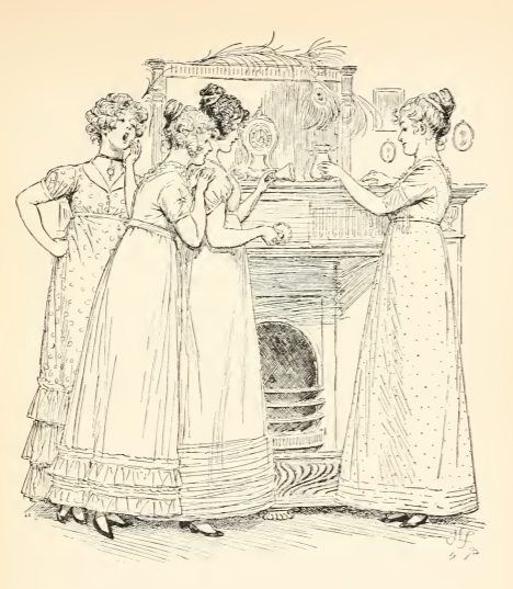 In this image Lizzy, Jane, Mary, and Lydia discuss Mr. Wickham and the other military men who were staying in Meryton. They get ready for a dinner where they will see the soldiers. Mary yawns because she took no interest in the soldiers or finding a husband. This scene occurs in chapter 16. The characters are shown in the traditional regency style. Lizzy, Jane, Kitty, and Lydia wear regency style dresses with empire waistlines and their hair tied up. The regency period dated to the early nineteenth century (1811-1820) when George, Prince of Wales, later George IV (r. 1820-1830), reigned as regent for his mentally ill father, King George III (r. 1760-1820). The regency period is associated with the rise of neoclassicism in art and fashion.