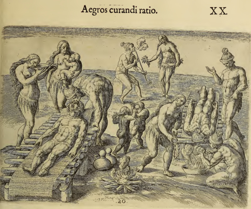 The sick lie on elevated beds made of wooden slats with woven mats laid on top. One lies on their stomach with their head hanging over the side of the bed and their face close to steam coming out of a pan on the ground. The other lies on their back being tended to by other individuals. There is a fire between the beds and two jugs on the ground. Children play between the beds, and a woman breastfeeds nearby. In the background, a man smokes from a long pipe.