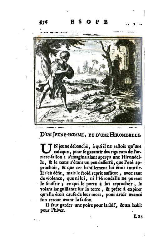 A young bachelor, to whom he had to wear only a coat to protect himself from the rigors of the cold weather, imagined that he had seen a swallow, and the weather being a little chilly, that summer was approaching, and that this clothing was useless to him. The first thing he did was to get rid of it, but the cold came on again, so violently that neither he nor the swallow could whip him; which led him to reproach her, seeing her languishing on the ground, and ready to expire, that she was to blame for their death, for having brought forward her return before dawn.