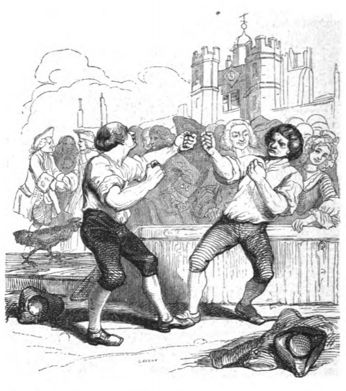 Here we see two men fist fighting in the street, while a crowd watches from behind a short wall. Their hats and coats are on the ground. In the background we see a large castle, and a rooster. In this chapter Gulliver talks with the King of Brobdingnag about English traditions. Gulliver tells the King about diplomacy, religion, the justice system, the arts, the financial system, and the nobility, then debated these issues with the king. This image comes when Gulliver is discussing the judicial system. The same image appears in both the 1839 and 1843 Krabbe editions.