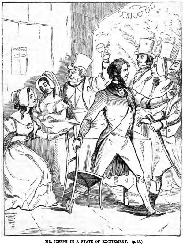 In the center of the image is Joseph Sedley, waving around his cup and singing. On the table before him is a bowl of alcohol which he has drunk all by himself. Amelia Sedley and Rebecca Sharp are seated at the table to the left of the image, with Rebecca gazing down at Amelia, who looks concerned. To the right is George Osborne, holding onto his chair and facing a crowd of onlookers, the nearest of which he is blocking from coming closer. Below the illustration is printed its title and location in the story, MR. JOSEPH IN A STATE OF EXCITEMENT. (p. 33.).