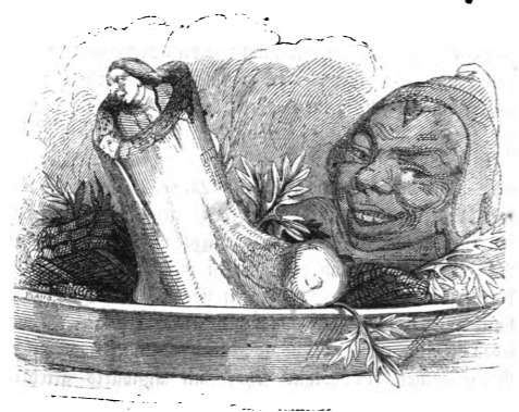 Here we see Gulliver stuck in the hollowed-out marrow of a bone. The Queen of Brobdingnag’s dwarf stuck Gulliver into the bone because he was jealous that Gulliver replaced him as the Queen’s favourite. In the image we see Gulliver stuck in the bone with only his head sticking out of the bone. The bone sits on a platter with other leaves and food. The dwarf’s face is visible in the background. The same image appears in the 1839 Krabbe edition.