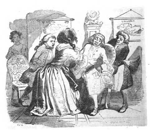 Here we see Gulliver’s reunion with his family. He was embraced by his wife and children, but he recoils. Gulliver finds himself disgusted by his family, preferring instead the family he lived with in the Country of the Houyhnhnms. Gulliver was especially distraught that he was a parent and had brought children into the world who lacked the virtues of the Houyhnhnms. The same image appears in the 1839 Krabbe edition.