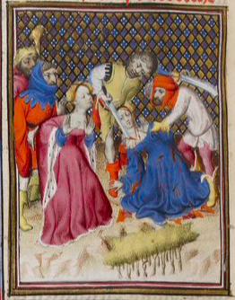 When Harmonia was ordered to be killed, her nurse arranged for a girl of her age to dress as Harmonia and die instead of her. This girl is seen in the image wearing a blue gown, and is getting murdered by the men behind her. Harmonia, wearing the pink gown, looks on with horror to the left of the girl who is being murdered. In the background are onlookers, and on the ground is the girl’s blood.