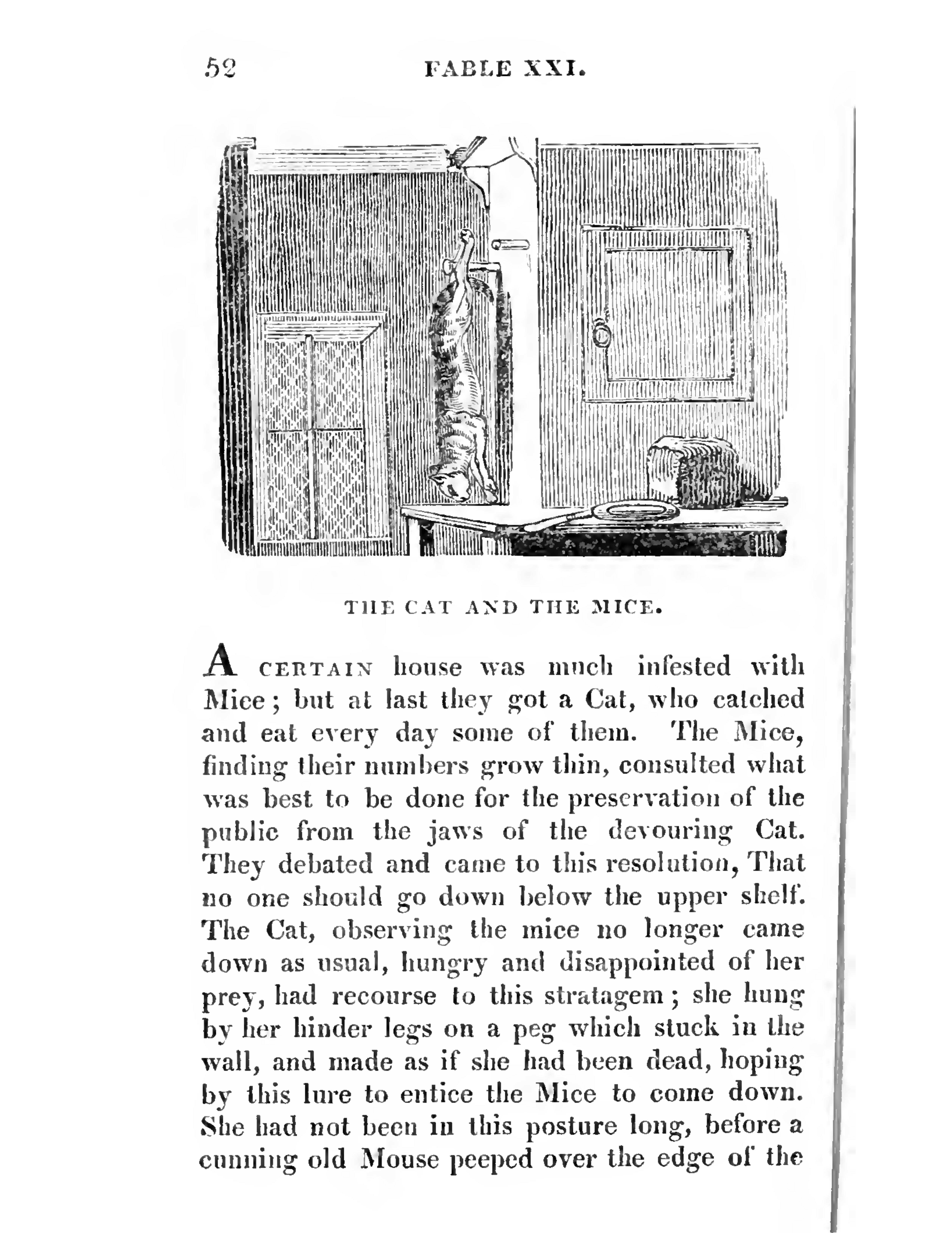 The background of the illustration was the interior of a house. On the left was a window with glazing bars and the right was a cabinet with hinged door and a hoop handle.A shelf with two level was in the center. A Mice was on the upper shelf, peeping down. A Cat was hung along the shelf by her hinder legs on a peg which stuck in the wall. Her head facing a table, which was extended from the bottom right to the center. To the right of the cat on the table, there were a butter knife, a plate and a lof of bread.