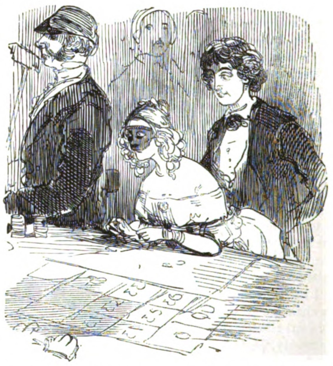 Rebecca Crawley, in a low-cut dress and black mask, leans over a gambling table. Behind her stands Georgy Osborne, who was brought there by Mr. Kirsch, his uncle’s courier, while the others went to the ball. Next to Becky is another man, facing away, with a stack of coins at his side.