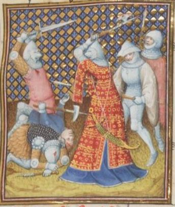 This illumination depicts a woman named Triaria wearing armor and holding an axe above her head. She is depicted wearing a dress to show that it is a woman. There are other soldiers standing with Triaria as they kill the people lying on the ground. Triaria is renowned for her military skills and devotion to her husband, Lucius Vitellius. She is depicted wearing a helmet and holding an axe in this image to demonstrate her fighting capabilities. Boccaccio explains that Triaria followed her husband into an enemy city and she fought violently and killed many citizens in order to magnify her husband’s glory.