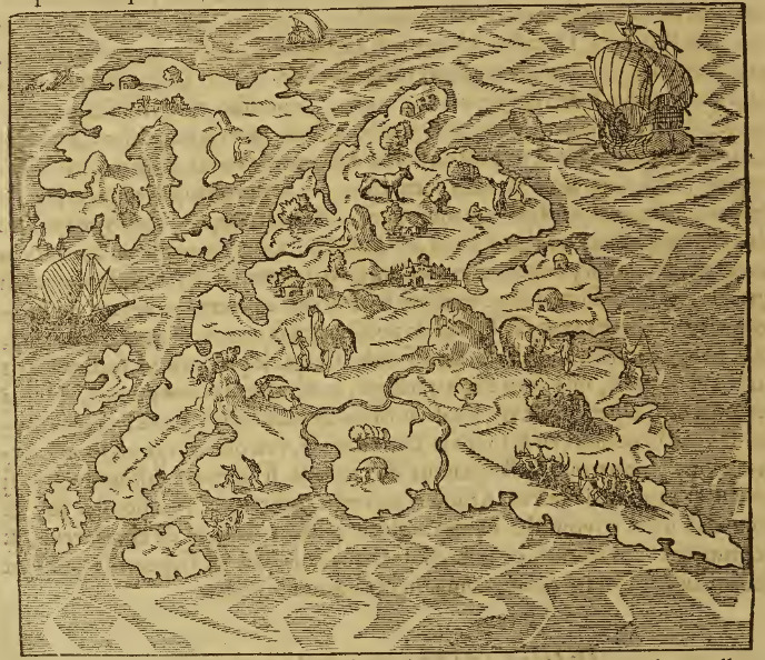 An aerial view of an island is shown, identified as Isle Espaignolle (Spanish Island – possibly Hispaniola, today Haiti and the Dominican Republic) by the author. Two groups of Indigenous people are engaged in combat with bows and arrows in the bottom right corner of the island. Elsewhere on the island, other Indigenous people fish and walk leading animals that resemble camels and elephants. There are several settlements on the island, as well as on a smaller island nearby. A large European ship sails in the top right corner. This image is identical to one found on page 911 verso of Paris, 1575 (Chaudière).
