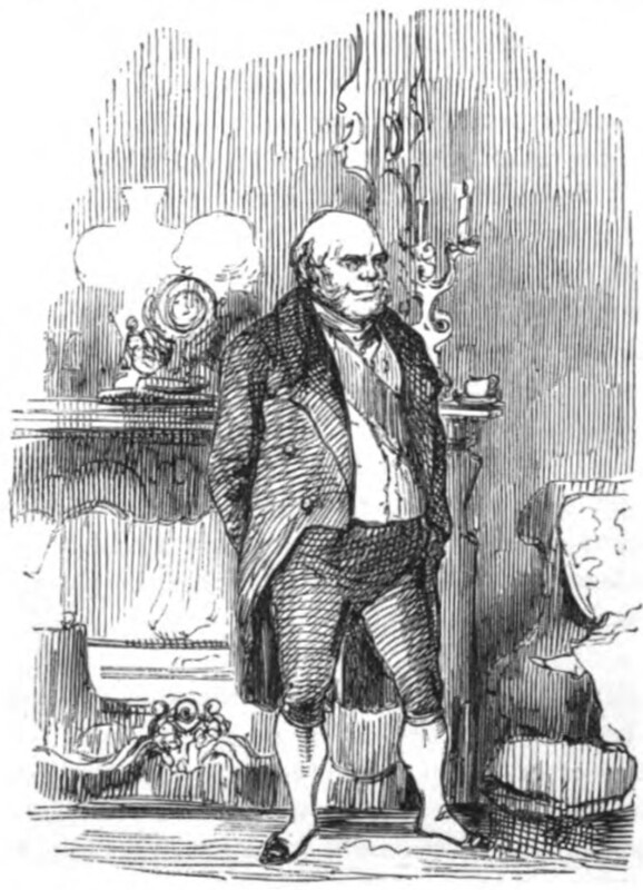 Lord Steyne, who has come to visit Becky, stands in front of an ornate fireplace topped with a clock and elaborate candelabra. He is short, bow-legged, and nearly bald, and dressed in fancy clothes with a coat and sash.