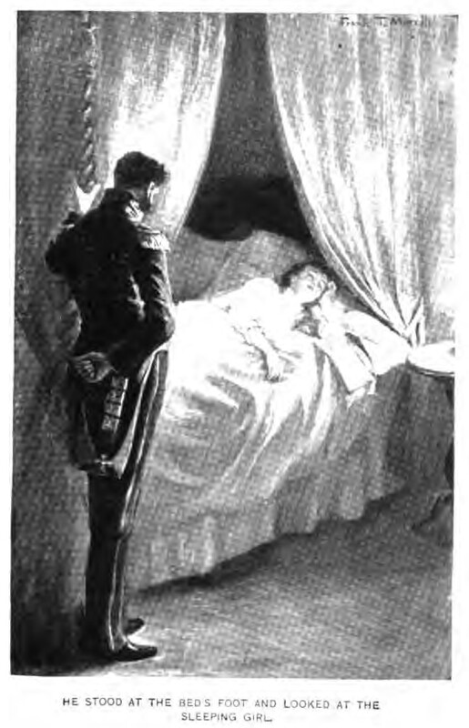 The picture depicts a scene from page 283 in Chapter XXIX in which George Osborne goes to see his wife before departing for the front. Amelia Osborne is depicted sleeping in a canopy bed with her face turned towards the reader. George is standing by the foot of the bed in his uniform, holding onto the curtain-rope with one hand and his other behind his back, facing towards his wife and away from the reader.